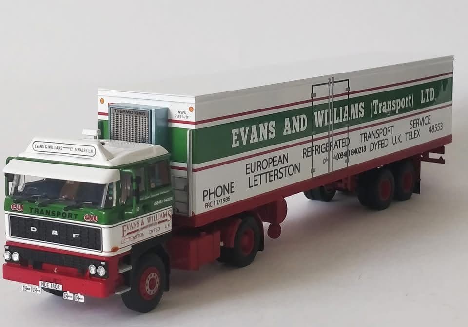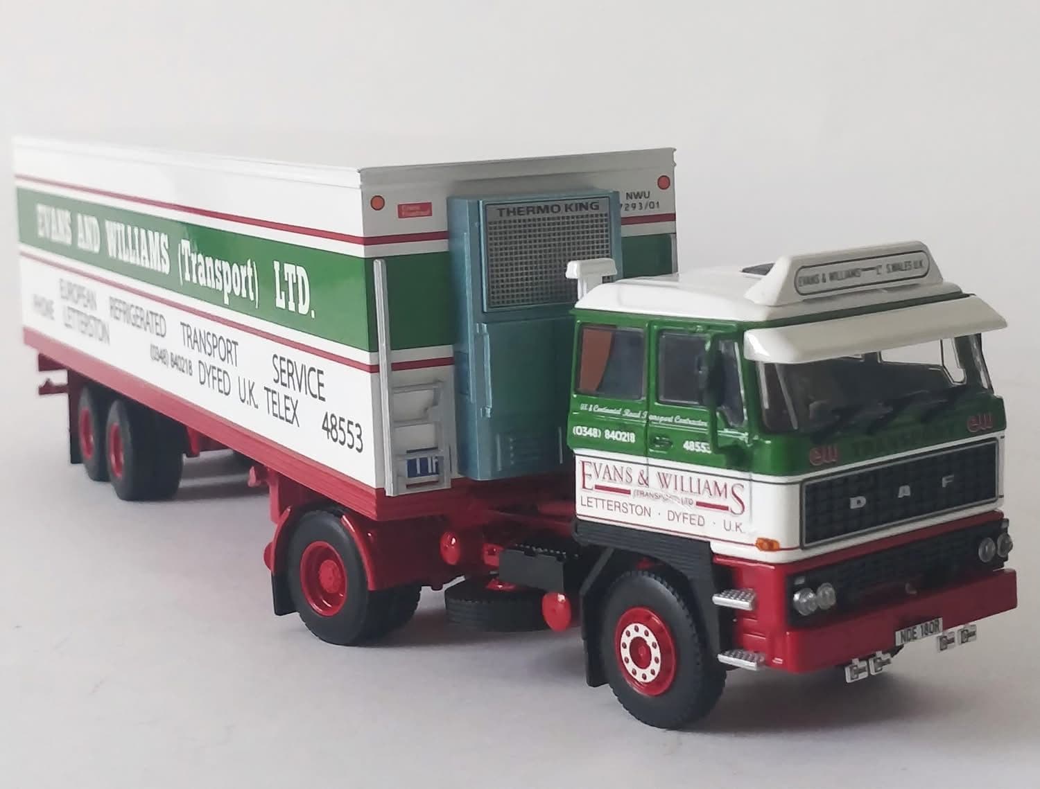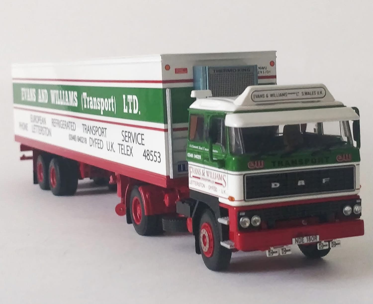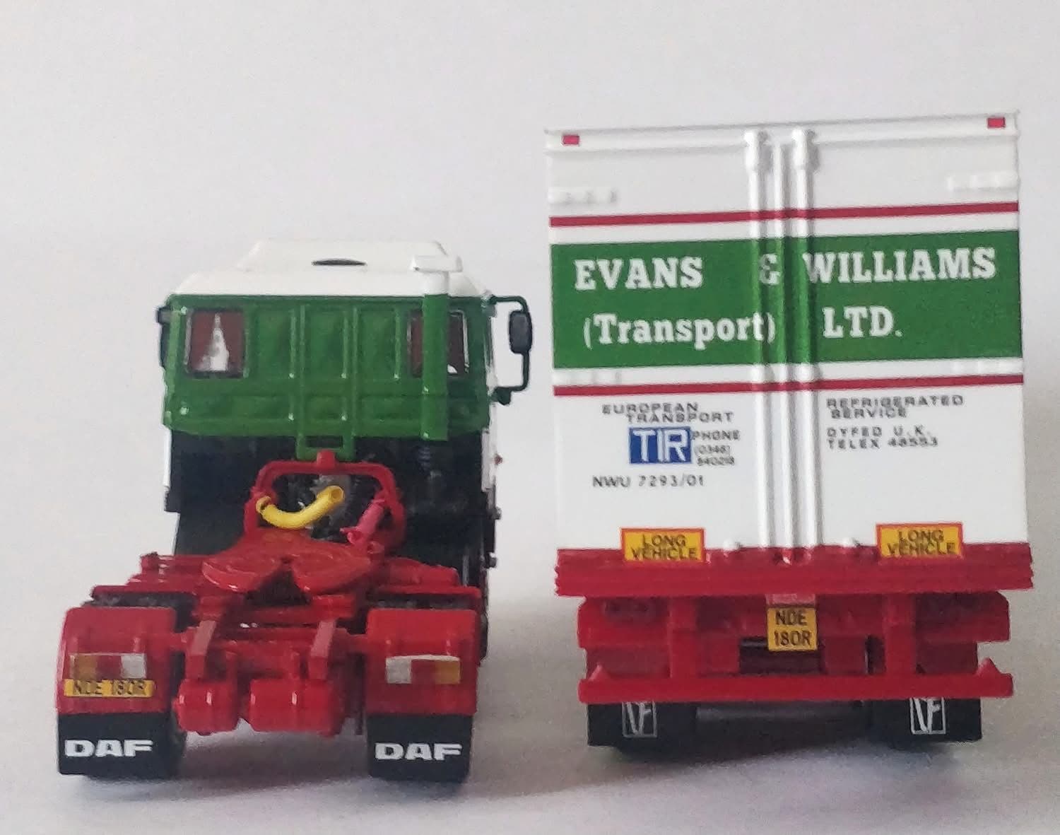 Diecast metal model of a Daf 2800 4 x 2 with classic fridge trailer in the livery of Evans & Williams Transport UK Ltd Dyfed Wales.