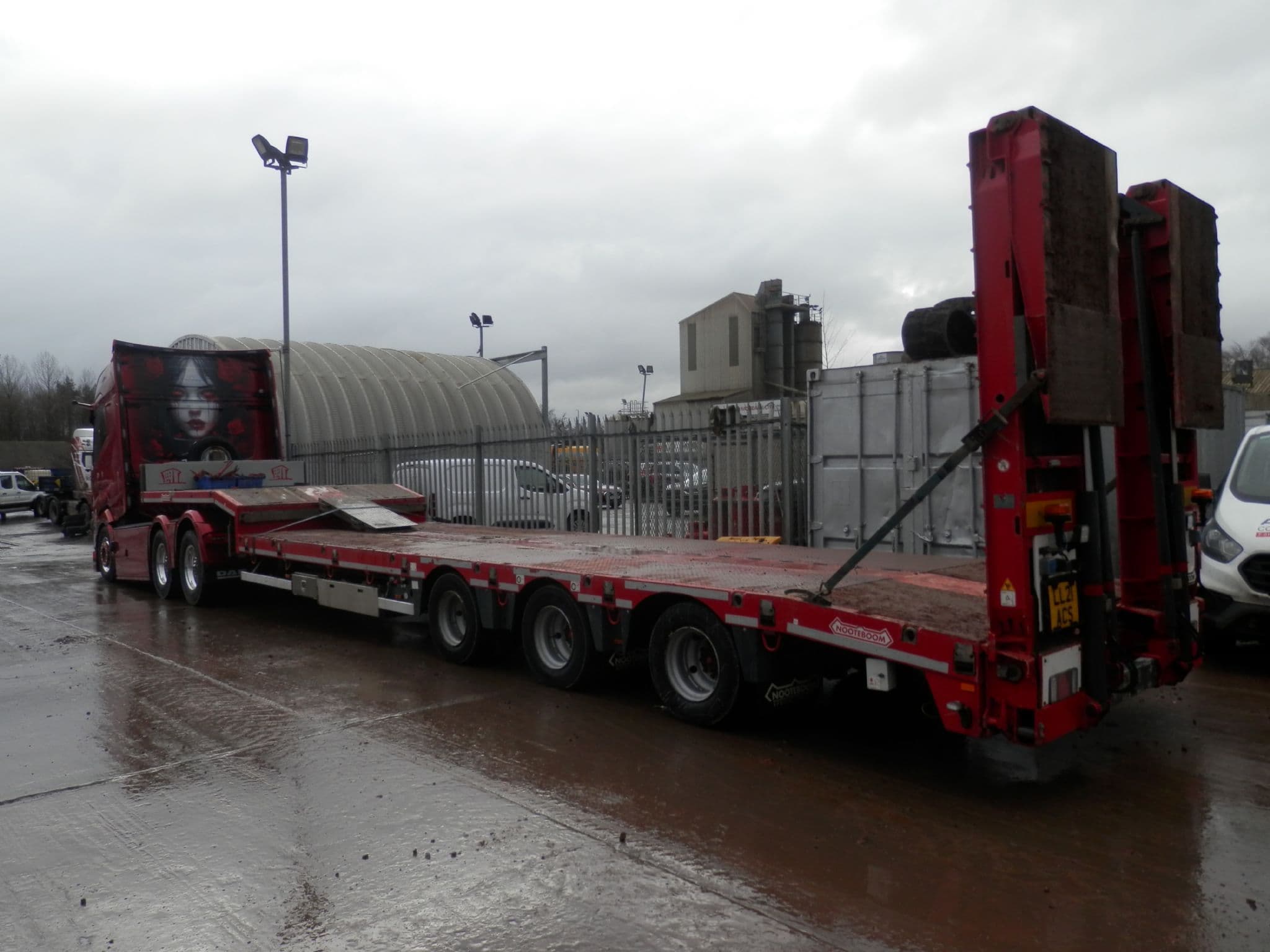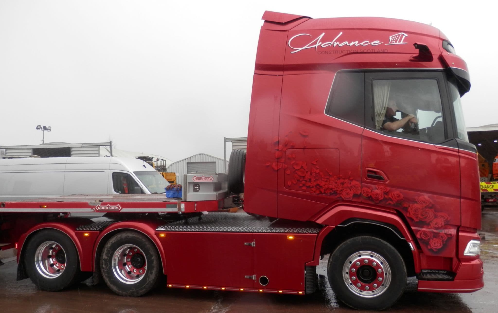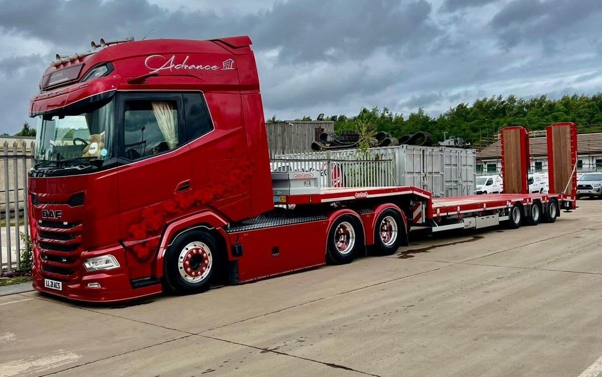 Die cast metal model of a Daf XG+ 6 x 2 twin wheel tag with 3 axle lowloader in the livery of Advance Construction Scotland.