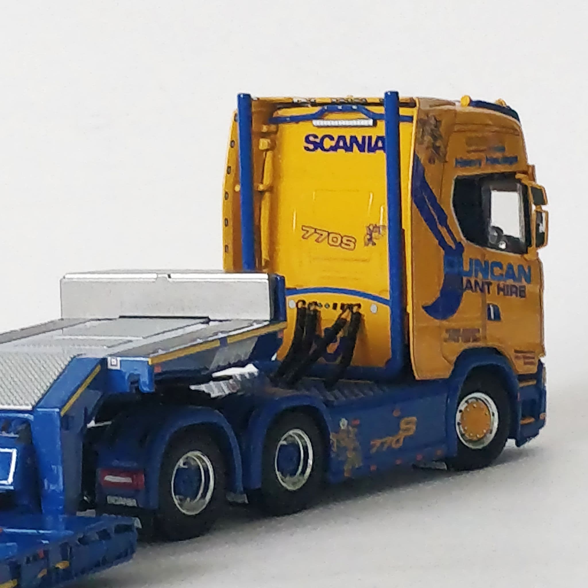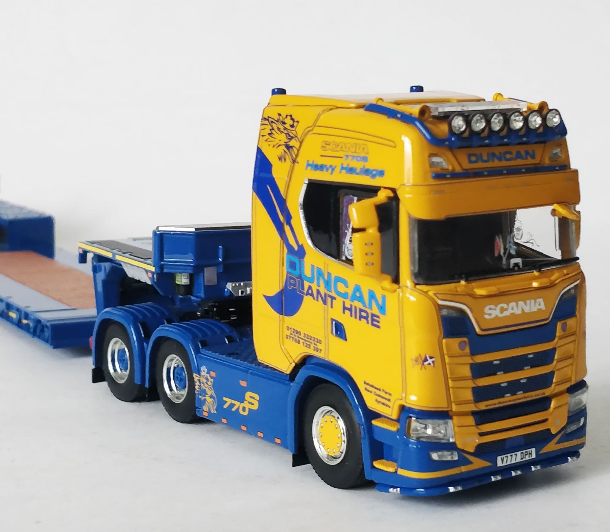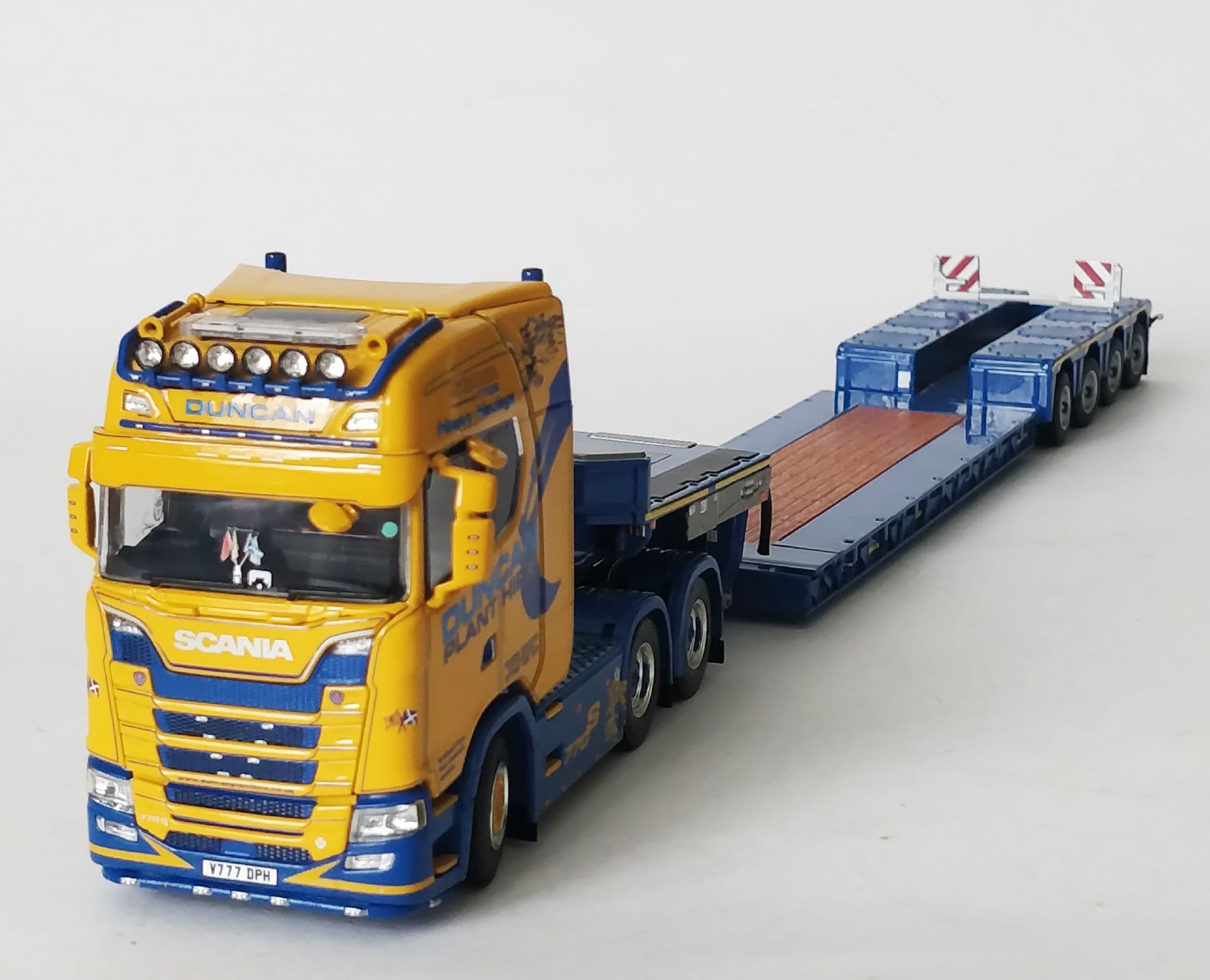 Die cast metal model of a Scania 770S 6 x 4 with 4 axle lowbed (No Interdolly) lowloader in the livery of Duncan Plant New Cumnock Scotland.