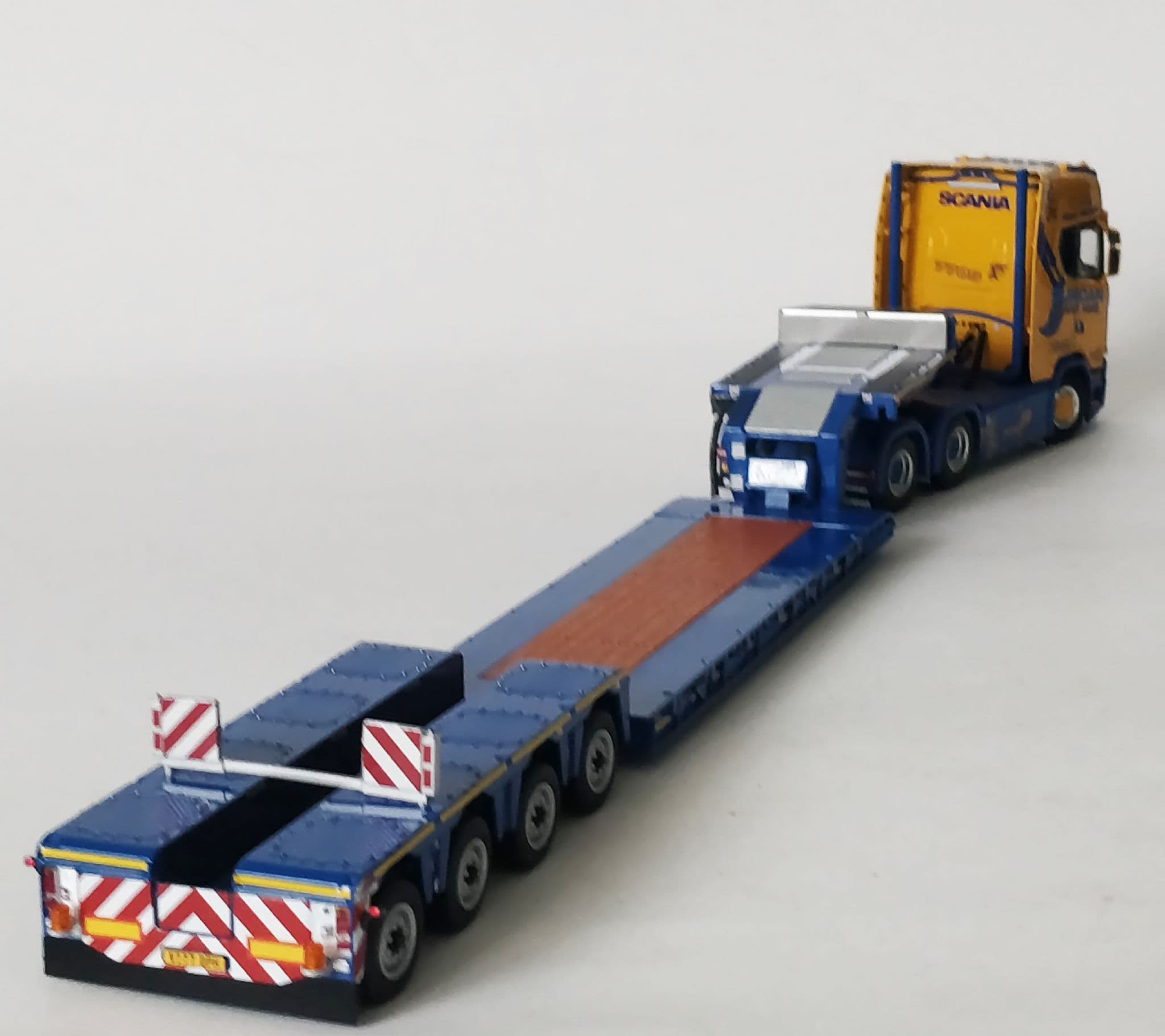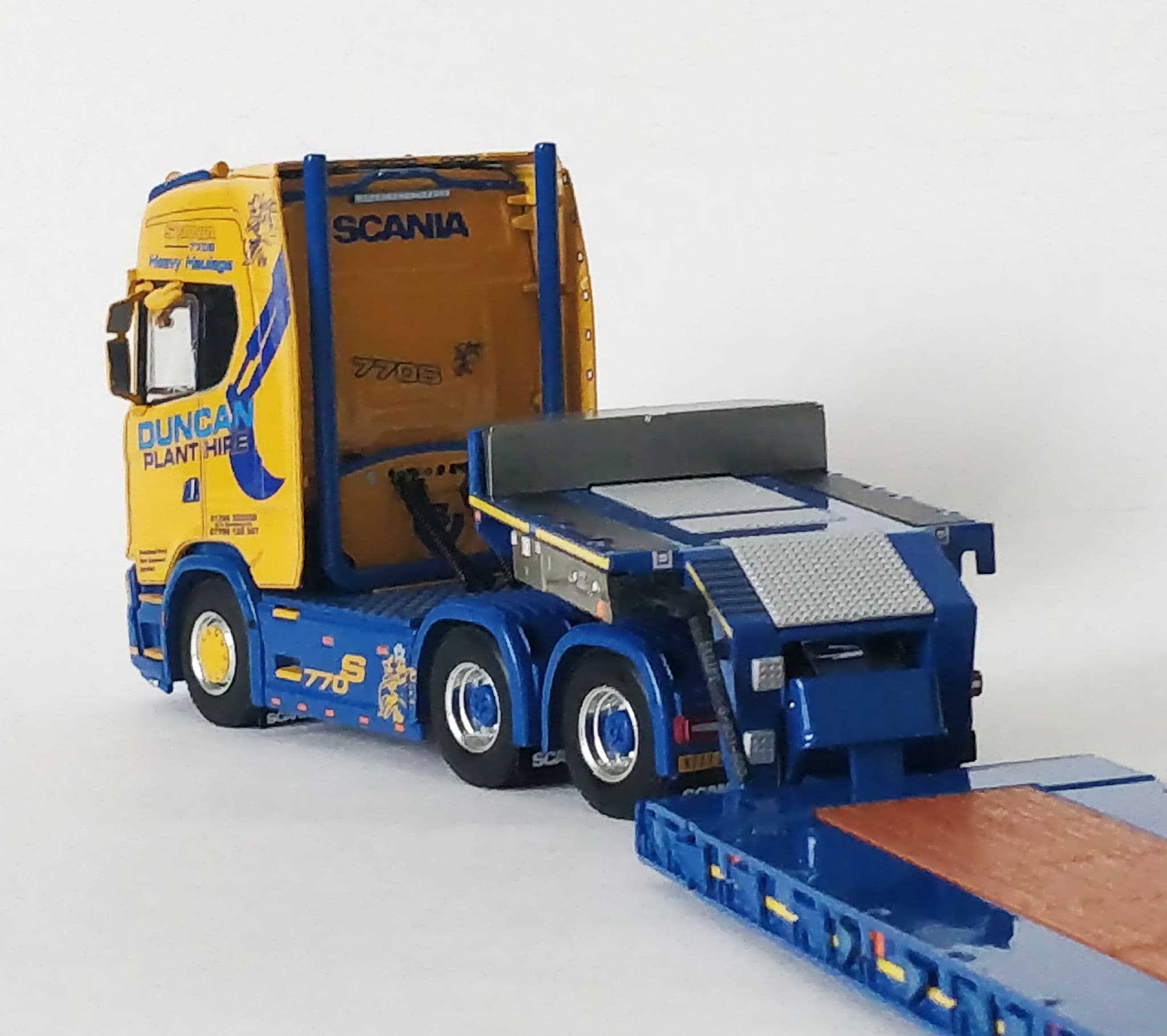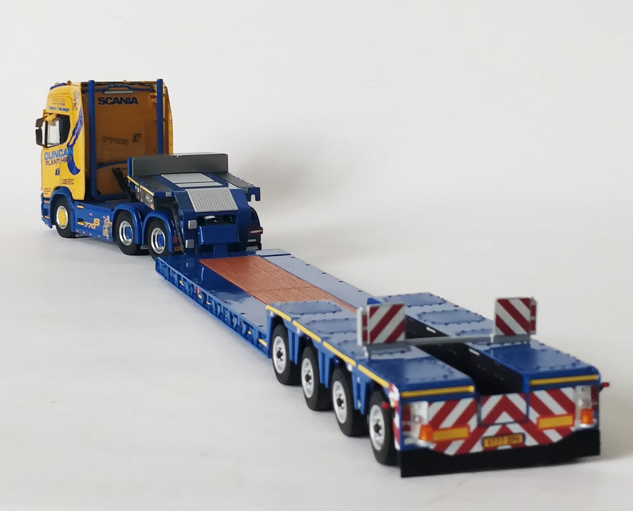 Die cast metal model of a Scania 770S 6 x 4 with 4 axle lowbed (No Interdolly) lowloader in the livery of Duncan Plant New Cumnock Scotland.
